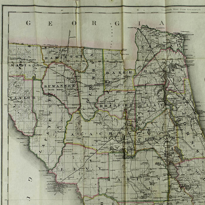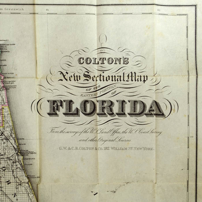 Cartouche: “Colton’s New Sectional Map of the Eastern Portion of Florida. From the surveys of the U.S. Land Office, the U.S. Coast Survey and other Original Sources. G.W. & C.B. Colton & Co. 182 William St. New York.”