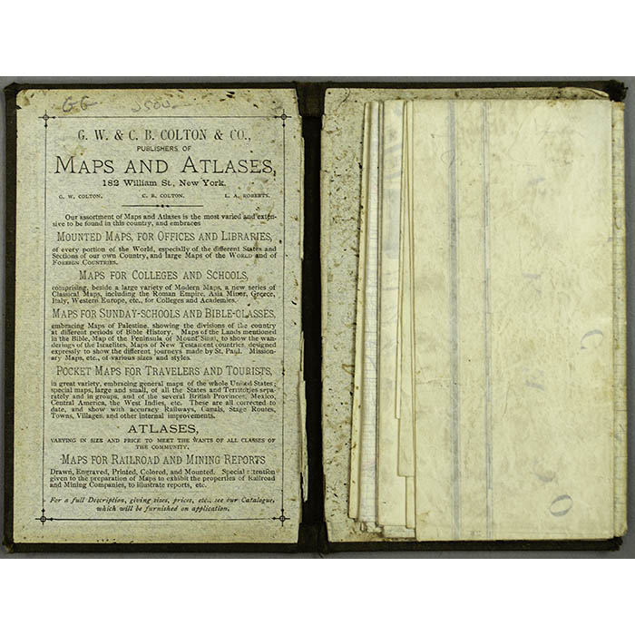 Between 1831 and 1890, the Colton firm dominated American map publishing and their atlases were the finest produced in the U.S. during the 19th century. The company was founded by Joseph Hutchins Colton (1800-1893), who had no formal training in geography or cartography; he began by purchasing copyrights of maps prepared by other individuals or companies, and his principal role was to manage the production and distribution of the maps. His first maps were drawn by the esteemed cartographer David H. Burr in the 1830s. By the 1850s Colton was also publishing guidebooks, atlases and immigrant and railroad maps. The firm was renamed G.W. & C.B. Colton in the 1860s when Colton was succeeded by his sons — George Woolworth Colton (1827-1901) and Charles B. Colton (c. 1831-1916). It is believed that George Colton compiled the company’s 1855 Atlas of the World and served thereafter as the firm’s principal map compiler, cartographer and engraver.