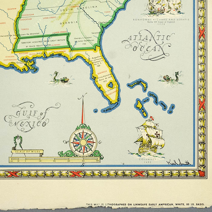 Karl Smith was a designer and illustrator of pictorial maps. His primary career was as an executive in the paper and graphic arts industries, but he drew maps as an avocation. Smith was also an active amateur historian who amassed a major collection on heraldry and genealogy and presented lectures on printing, paper, color, heraldry, and the life of Benjamin Franklin. In the 1930s and 1940s, the Speed Art Museum (then the J.B. Speed Art Museum) in Louisville, Kentucky, commissioned Karl Smith to make a series of pictorial maps of the states. In 1959 he created a series of four historical pictorial maps of the United States for Linweave Paper Company, showing the nation’s growth and development from the colonial era to the present. Over the course of his career he produced maps of North Carolina, Arkansas, Ohio, Mississippi, Illinois, Indiana, Kentucky, Florida, the Stratford Plantation in Virginia, and historical maps of the lives of Abraham Lincoln and Robert E. Lee.