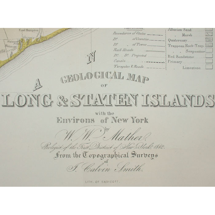 William W. Mather was Professor of Natural History at Ohio University, and served as Geologist of the First Geological District of New York for Governor William H. Seward. In his introduction to the text accompanying the map, Mather thanks the Long Island community for its cooperation. He notes a humorous instance in which the owner of one Long Island farm assumed that the rocks Mather gathered from a nearby road must have contained gold, given the extreme care that Mather took in collecting and preserving the specimens, and therefore tried to prevent the geologists from taking them.