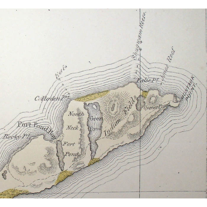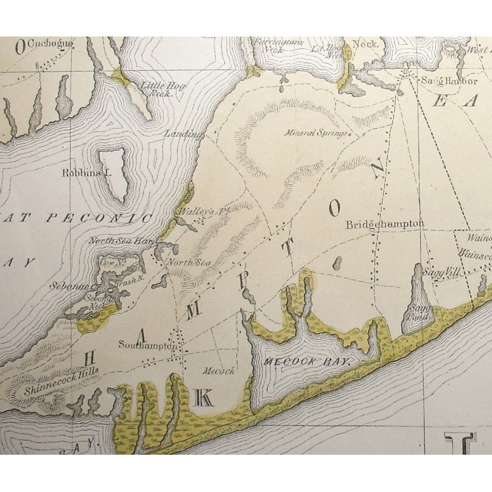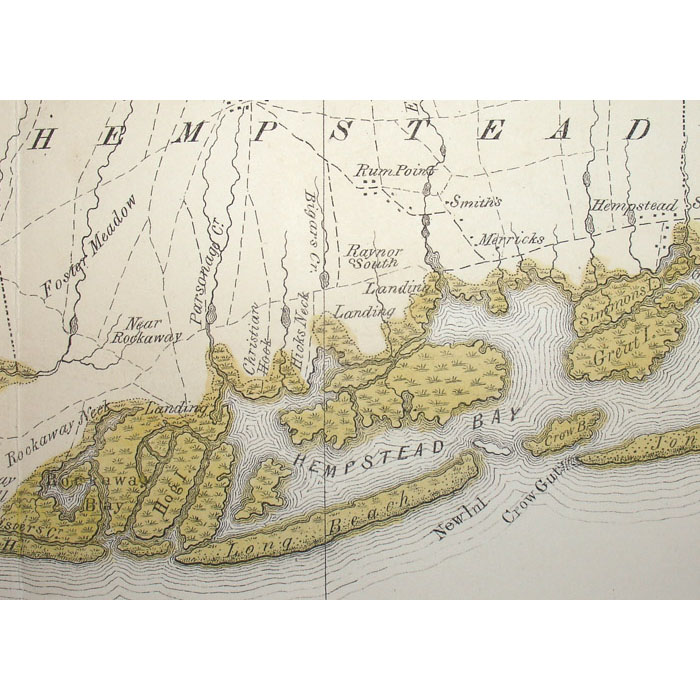 Long Island was among the first areas in the New World reached by European settlers. The town of Southampton on the eastern tip was settled in 1640. The island and its coast were mapped in the 18th century by the British up to the time of the Revolutionary War. The best-known sea charts were made for the British Admiralty by F.W. Des Barres. In the 19th century, a concerted effort began in the America to map the interior of the United States. This mid 19th century map was a joint effort by W.W. Mather, a geologist, and the surveyor J. Calvin Smith, also well known for his huge wall map of the State of New York. By the end of the 19th century, the Long Island Railroad was actively promoting development on the island, and issued many maps to encourage New York City residents to build houses and farms east of the city. The offered map shows what are now popular vacation locations on Long Island including West Hampton, East Hampton, Southampton, Bridgehampton, Sag Harbor, Amagansett, Montauk, Glen Cove, Jones Beach, and Fire Island.