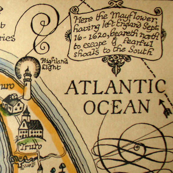 Waugh’s map of Old Cape Cod was rendered and issued by him in two different versions, one published in 1926 and the other published in 1930. These maps were also issued in various sizes. The Cape Cod maps were often hand-colored, possibly by Waugh or otherwise by assistants in his studio, thus giving rise to variations among them.