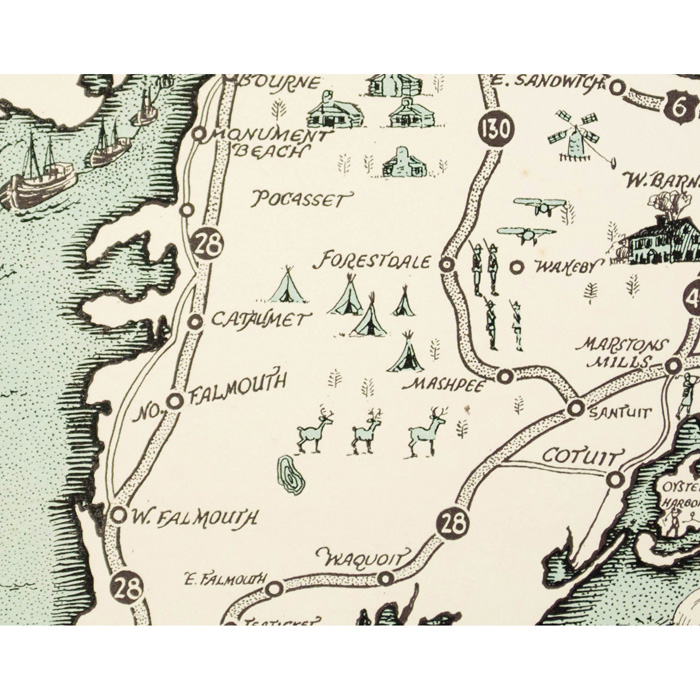 Cape Cod is unique and rich in historical lore. Nowhere in the world can be found fifteen towns comprising one hundred and forty-three homelike villages with such qualifications. Facing four salt seas. Five hundred and eighty-six miles of shore line. Three hundred and six miles of beaches. Enclosing two hundred and seventy-seven beautiful natural lakes. Over 2000 miles of hard surfaced roads invite the motorist.