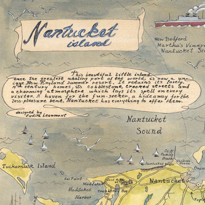 A hand-lettered note by Learmont celebrates Nantucket’s transformation from a historic whaling hub to a beloved New England vacation destination, emphasizing its timeless allure: