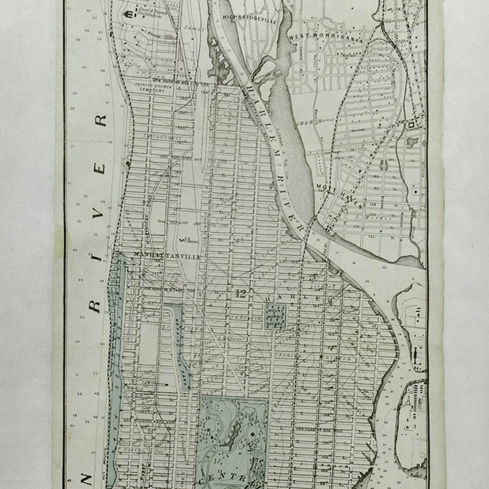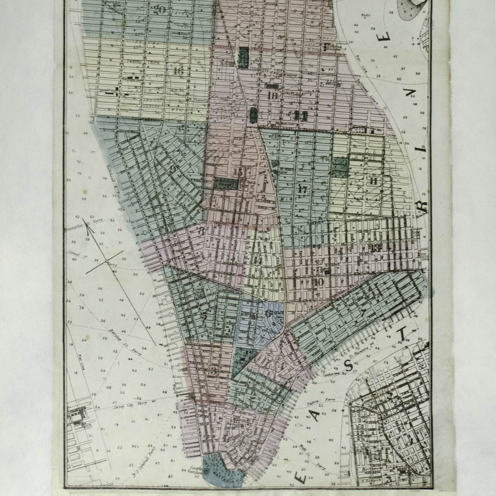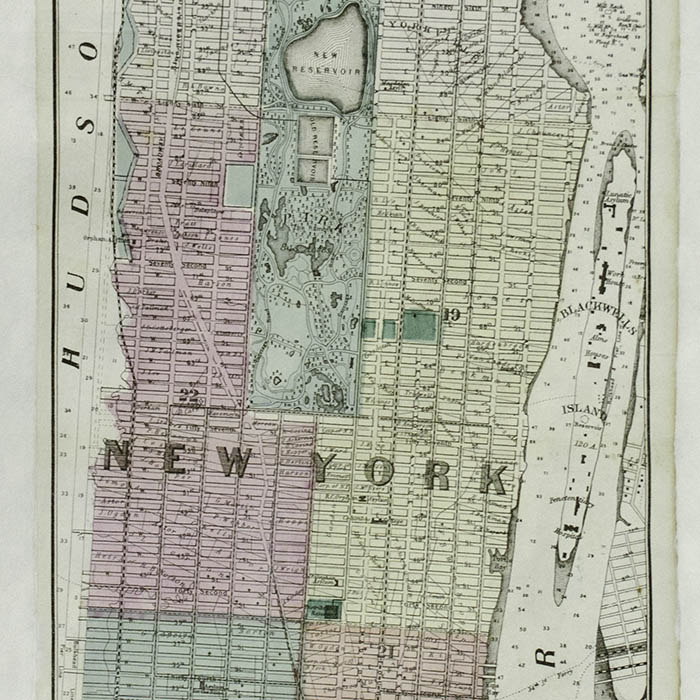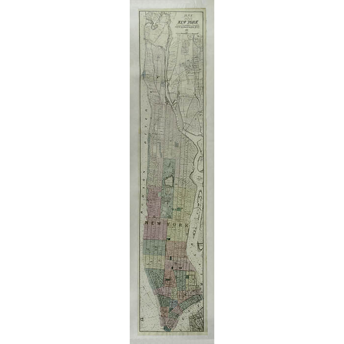This long map was originally produced as the folding frontispiece for an edition of Shannon’s Manual of the Corporation of the City of New York, an annual publication that included almanac information and facts about the city’s political organization, history and the progress of public works projects. Other examples of this map are in the collection of the New York Public Library and the Stanford University Libraries.