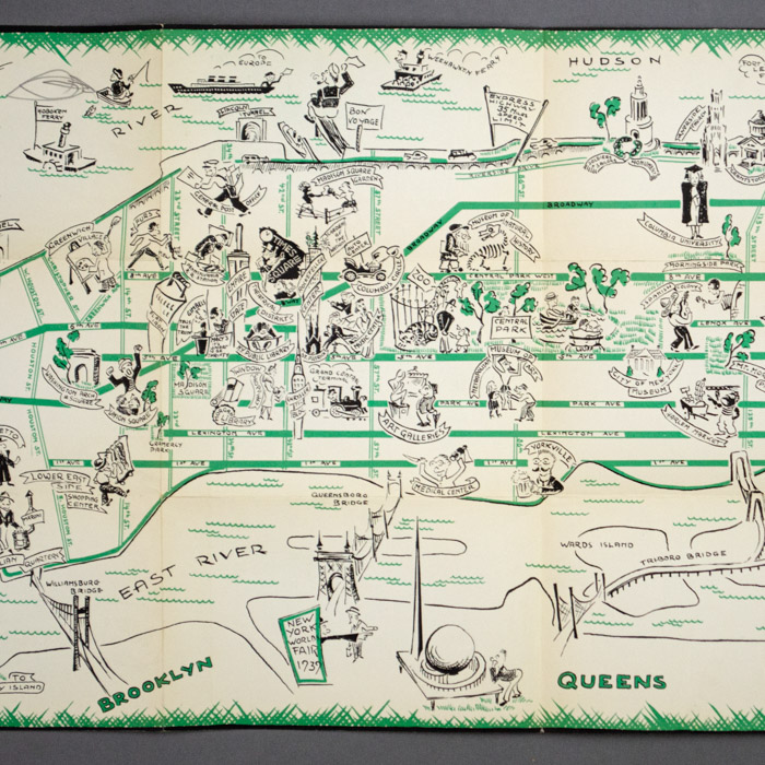 The map, printed in green and black, was issued folded in a pocket accompanying the book Cartoon Guide of New York City by Nils Hogner and Guy Scott. The book was the second volume published in the series Augustin’s Cartoon Guides of America, which as of 1938 included seven published and planned books. The guidebook itself is a straightforward and informative travel guide written in a breezy style, with small, cartoon illustrations.