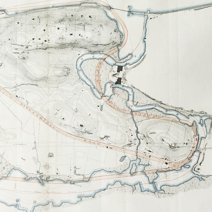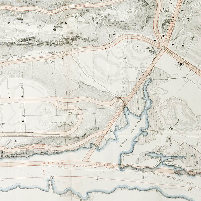Contrary to the commissioners’ expectations, by mid century it was necessary to plan the area north of 155th Street. In 1860 the state legislature created the Washington Heights Commission to develop a plan. They created an elaborate topographical survey and map, but no definitive plan was presented. Finally, in 1865, the legislature transferred the Washington Heights Commission’s authority to Andrew H. Green’s Central Park Commission, and things began to move. This map of 1868 records Green’s preliminary scheme. It is a compromise between the vision of 1811 and the rocky realities of uptown topography. A rectilinear grid fills the flatlands, but angled and curving streets run around the hills. Green also created two new scenic waterside parks, today’s Fort Washington Park and part of High Bridge Park, and redrew the bulkhead line so that the island’s edge could be extended to accommodate a road along the shoreline.