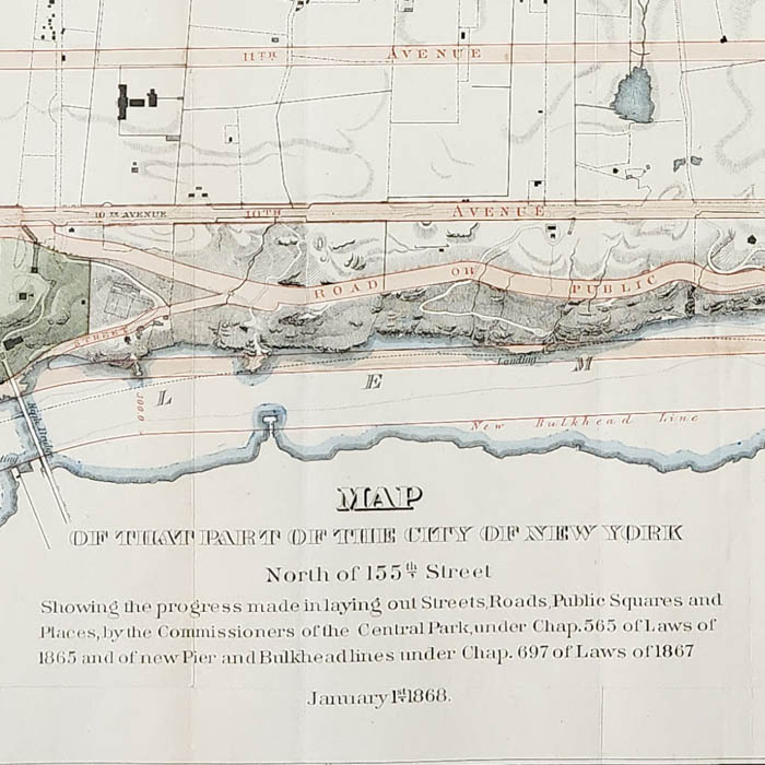 Map of that Part of the City of New York North of 155th Street Showing the progress made in laying out Streets, Roads, Public Squares and Places, by the Commissioners of the Central Park, under Chap. 565 of Laws of 1865 and of new Pier and Bulkhead lines under Chap. 697 of Laws of 1867.