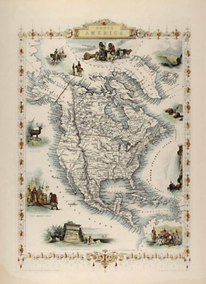 Charming unusual map of North America set within decorative border, and illustrated with vignettes of native peoples, historical events, and natural wonders. Map generally uncolored, but with blue wide outline highlights. Vignettes fully colored.
