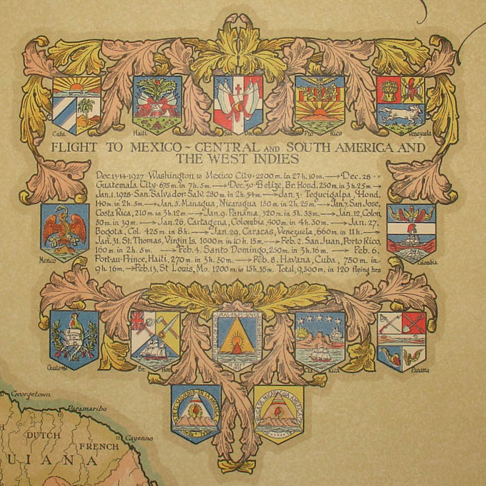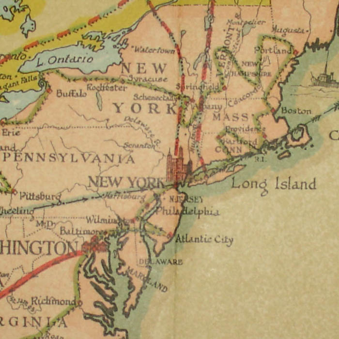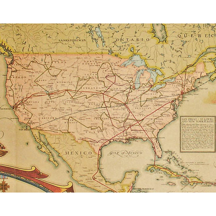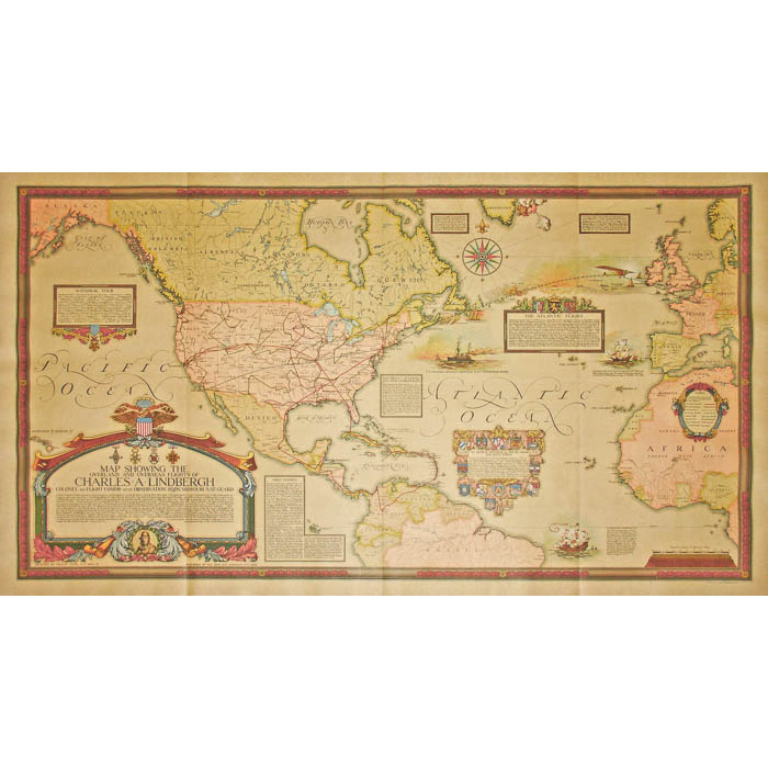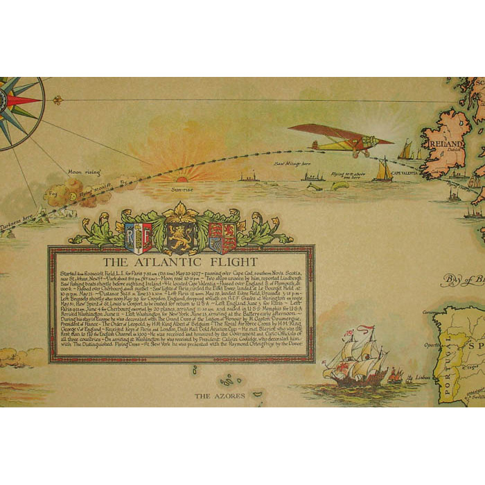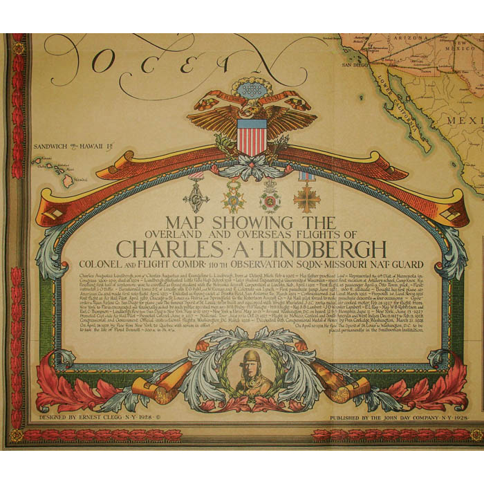 Clegg is probably best known for his pictorial maps that combined precise illustrations with historical facts and accuracy. His most renowned is A Map of Lindbergh’s Flights (1928), published as a wall map on rollers or folding. His other pictorial maps include the Ticonderoga Colonial battlefields, Washington, D.C. and environs (for the bicentenary of George Washington), a chart of the site for the America’s Cup Yacht Races of 1934, and a series of county maps of Great Britain published by The Countryman (1945-47).