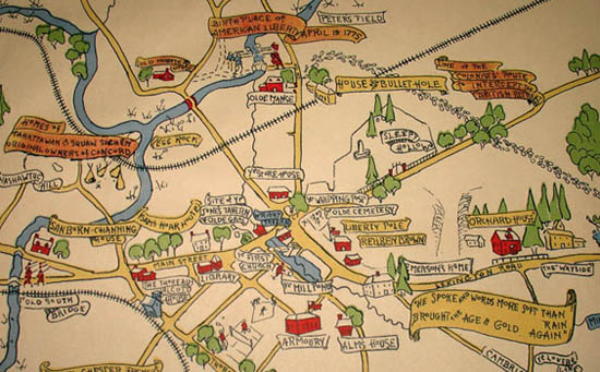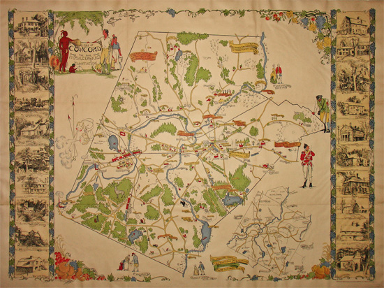 Richly detailed pictorial map of Concord, Massachusetts, a town that played major roles during the Revolutionary War and in 19th-century American literature. The left and right borders contain 20 detailed line drawings of historic buildings. The map labels streets, bodies of water, and neighborhoods. Wooded areas are indicated by drawings of trees, colored green. Historic buildings and locations are shown with pictorial illustrations, including Walden Pond and “Thoreau’s Hut”; Ralph Waldo Emerson’s House; tepees marking the site of the original Native American residents, “Tahattawan & Squaw Sachem”; Sanborn Channing House; and civic buildings. Other illustrations mix depictions of 18th- and 19th-century figures and modes of transportation, such as stage coaches, with contemporary residents, such as a golfer and a tennis player at the Concord Country Club and “At Least One of Concord’s Artists” seated at an easel. Near a small depiction of Paul Revere’s ride, a red-coated British soldier looks up at a Minuteman with a musket. Banners bear quotations from local authors Emerson and Thoreau, as well as historical information.