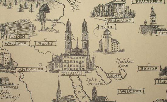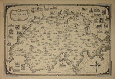 Pictorial map of Switzerland, filled with drawings of landmarks and historic sites. Geography is simple: rivers and lakes; cities and towns, many of them accompanied by a small illustration of a landmark building; and mountains and glaciers, drawn in perspective. Surrounding the nation’s borders are rhumb lines converging on a compass rose; there are also numerous inset illustrations of scenic places, buildings and bridges. The map is enclosed within a simple Art Deco border accented with Swiss crosses. The Harvard University Map Collection owns an example of this map.