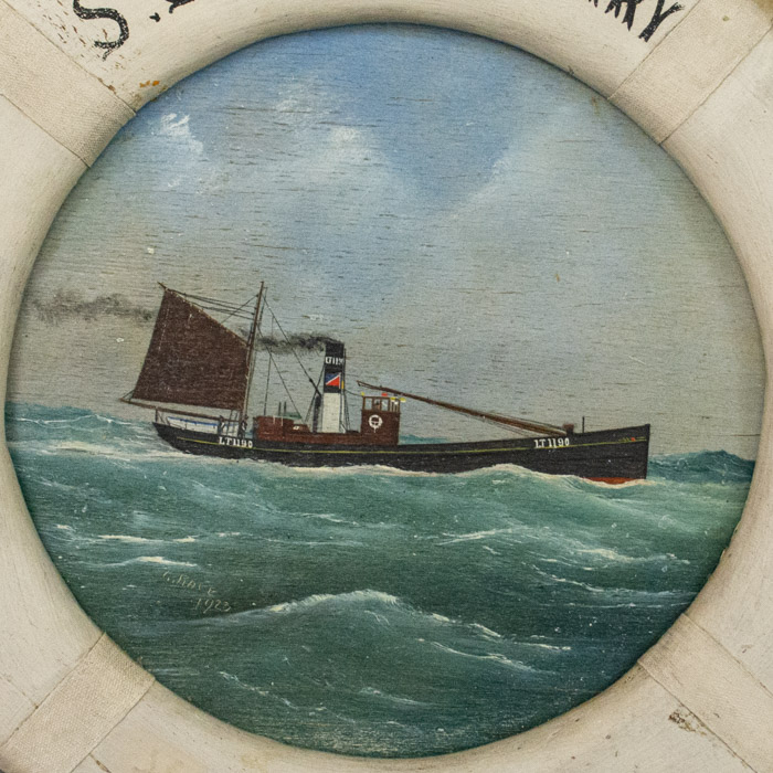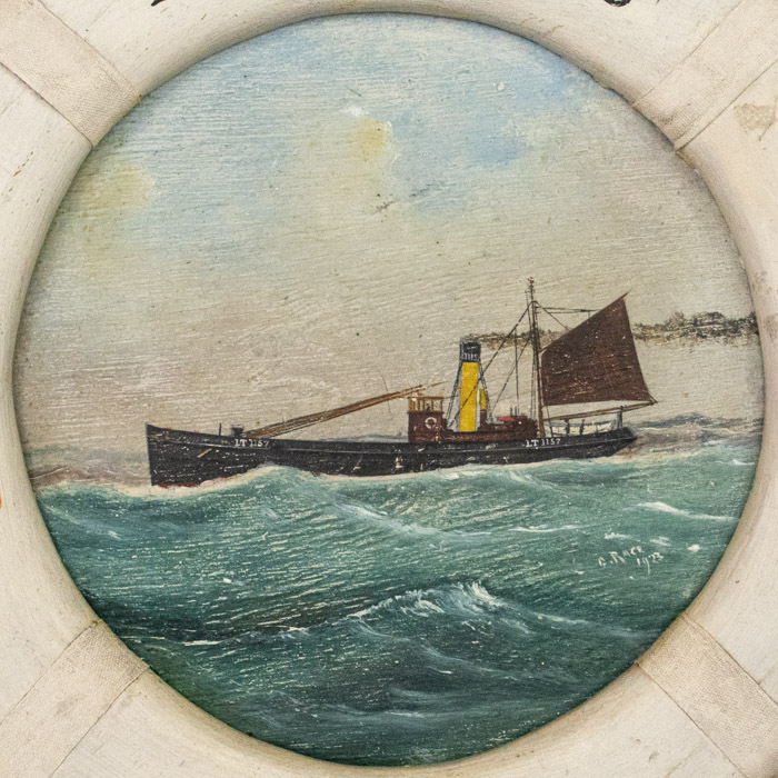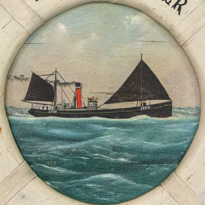 George Race was a British folk artist based in Suffolk, England. A 2005 article in Britain’s East Anglian Daily Times described his paintings in the collection of the Lowestoft and East Suffolk Maritime Museum, and explained that Race was among a group of maritime artists known as “pierhead” painters who were patronized by sailors and crewmen: