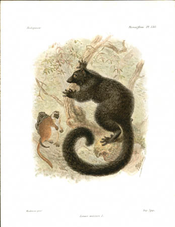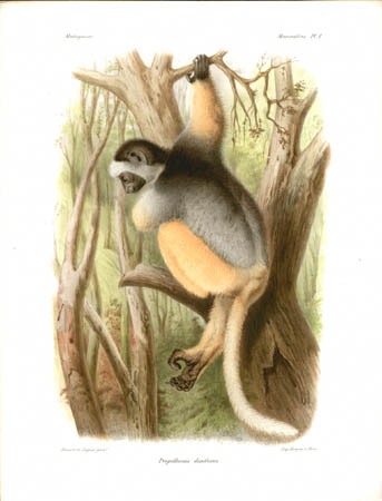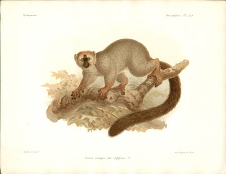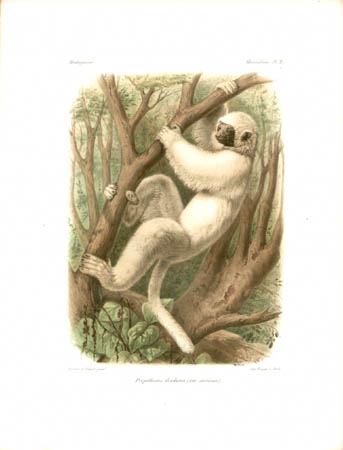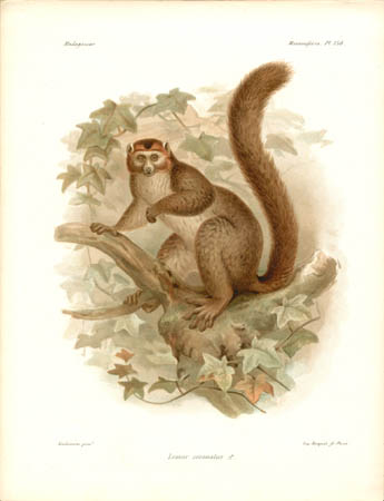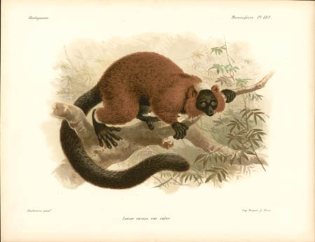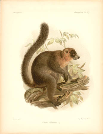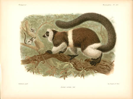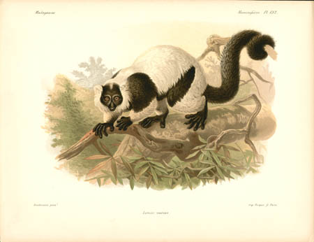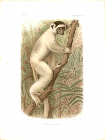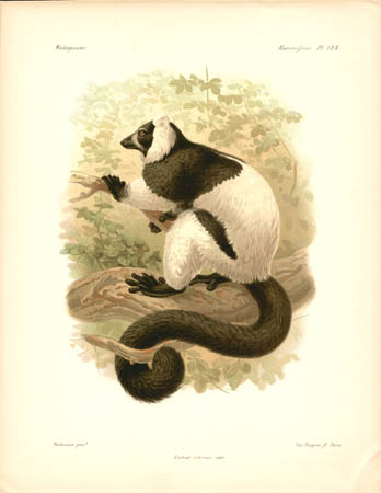 Lemurs are primates native only to Madagascar and make up most of the mammals depicted in the natural history portion of this work. Other sections of this work illustrated birds, mollusks, fish, butterflies and insects of Madagascar. John Gerrard Keulemans, an artist mainly known for his ornithological paintings, produced most of the bird illustrations for L’Histoire… and also contributed some of the illustrations of lemurs. Bocourt and Faguet, who did the rest of the lemur paintings shown here, were natural history artists whose works include botanical plates for other French works.
