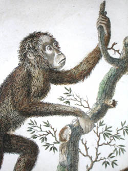 Natural history studies of monkeys and primates. As was typical of 18th and early 19th century natural history studies, the animals are generally shown on a patch of landscape against a white background, some perched upon small tree stumps. These prints highlight the climbing abilities of the monkeys, including the grasping capabilities of their tails and feet. Despite the attention to detail and scientific accuracy, there is an artificiality seen in other European studies of this era, in the slightly human manner of posing, and the anthropomorphic facial expressions.These plates come from a series on the animal kingdom, showing a wide variety of species, including elephants, rhinoceroses, lions, monkeys, horses, reptiles, butterflies and insects. Some plates also depict indigenous peoples. These are early examples of educational natural history books about the animal kingdom, a genre which remained popular throughout the 19th century. They are also early examples of lithographic printing, which had been introduced by German inventor Alois Senefelder in the 1790s.
