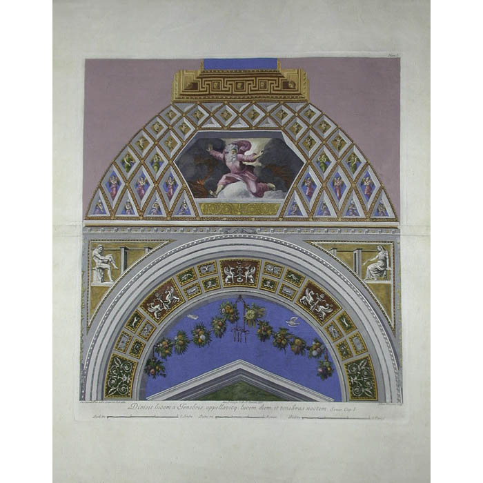The prints in this set are based on renderings by the painter Gaetano Savorelli and the draughtsman Ludovico Teseo. Pietro Camporesi (1726-1781), a Roman architect worked for Pope Clemens XIII and Pius VI in the 18th Century on rooms for the Vatican Museum, and contributed to designs in Loggia di Rafaele nel Vaticano, particularly its frontispiece. The prints were etched and engraved by Giovanni Ottaviani and Giovanni Volpato (1740-1803). These artists took some liberties in borrowing elements from Raphael’s Vatican tapestries to fill in elements that were illegible in the original frescoes due to deterioration over time. Thus, the prints are amalgam of actual and supposed design elements of Raphael.