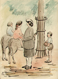 Charming scene of a Parisian park, of a woman with a small boy holding a ball and two girls riding ponies.