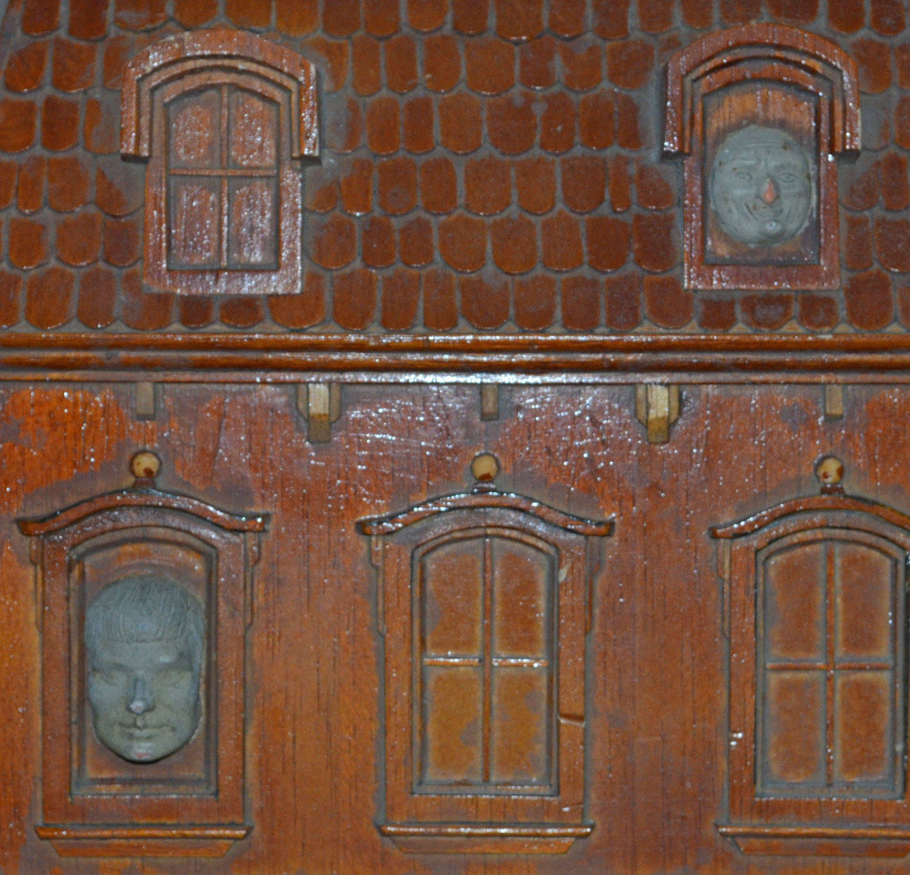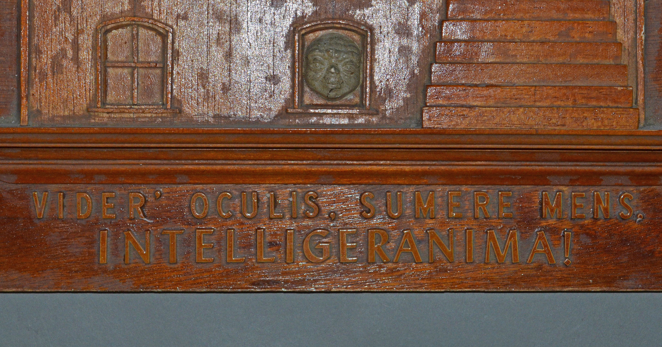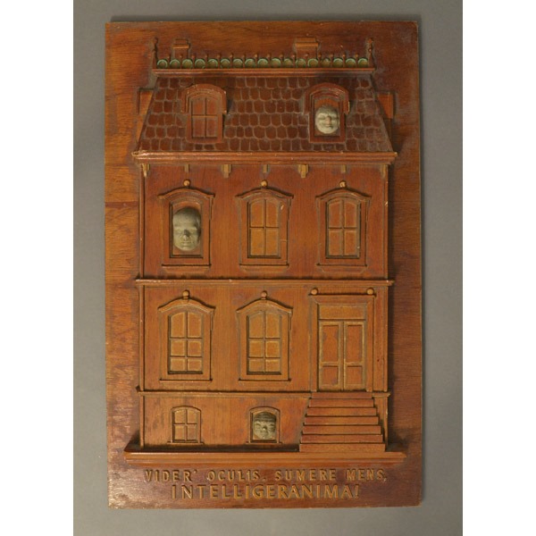 An unusual, inventive and whimsical artwork relief plaque in the form of a house façade. It is executed with raised architectural details including a roof with chimneys, windows, stairs leading to a door, etc. Three faces variously peer out some of the windows. Under the house is a saying partly in Latin: “‘Vider’ Oculis, Sumere Mens, Intelligeranima!” To our knowledge, there is no such popularly known Latin saying and intelligeranima is not a real word. However, if you break it into “intelliger anima,” it could be interpreted as, “Sees with his eyes, uses his mind, to understand life!” Nonetheless, it is subject to other interpretations.