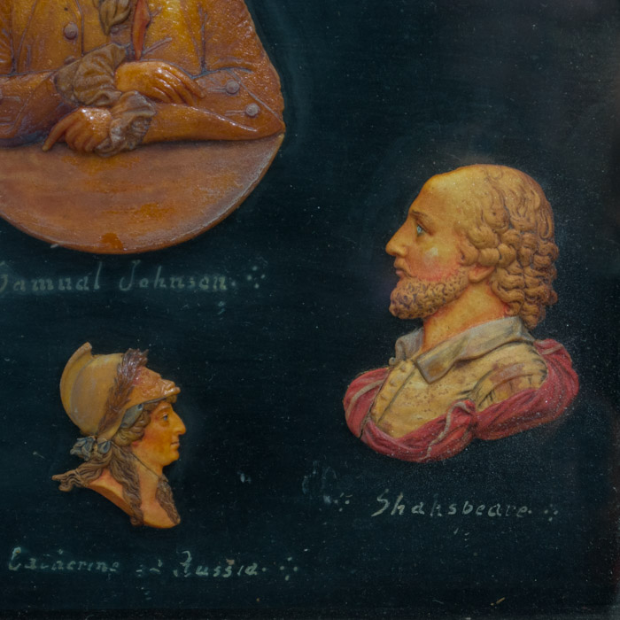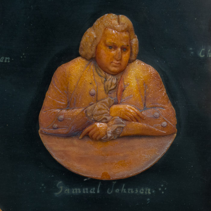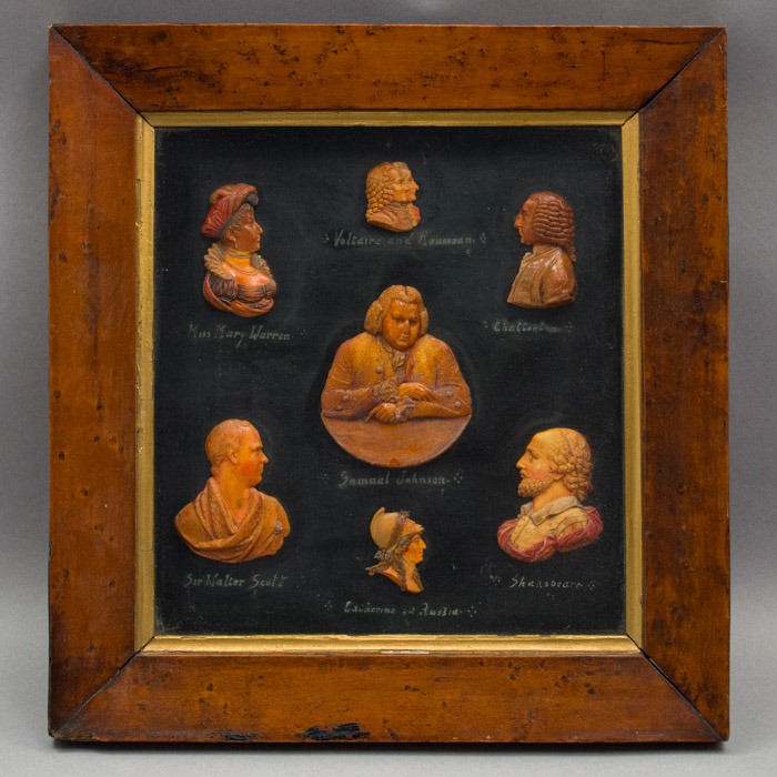 The composition of the set is symmetrical and orderly, with similar sized profile figures facing one another from either side around the roughly circular frontal portrait of Samuel Johnson at the center. As explained on the card label verso handwritten by the collector with initials, J.S., in Richmond, England, he collected the wax figures over a lifetime from various travels “round about the world” and made this framed arrangement. It is No. 14 of his larger collection of 24 framed portrait arrangements that he put together. Given the disparate nature of some of the various individuals shown, it can be deduced that the wax portraits were selected, and then arranged aesthetically, rather than on attributes such as field or nationality.