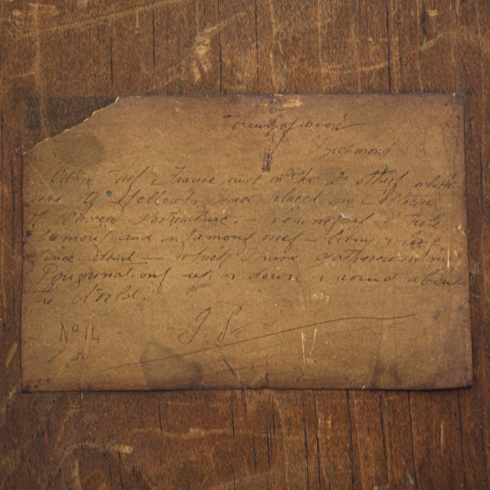 Manuscript text of original card verso: [? Richmond [England]. Within this Frame, and in the 23 others which are its fellows, I have placed my collection of waxed portraiture: – Likenesses of those famous and infamous ones – living and long since dead – which I have gathered in my [personal ones with a ?] & round about the world. No 14 – J. S.