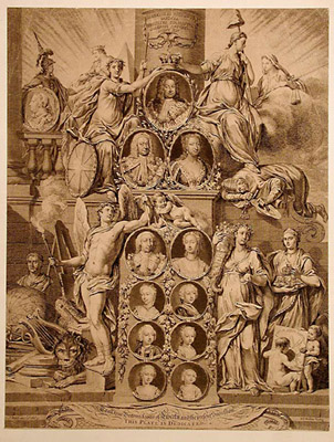 A female figure bearing a bell has one foot on the back of a sleeping figure holding a set of keys. One interpretation is that the sleeping figure is Saint Peter, who upon the current king’s death will be awakened to let him into Heaven.