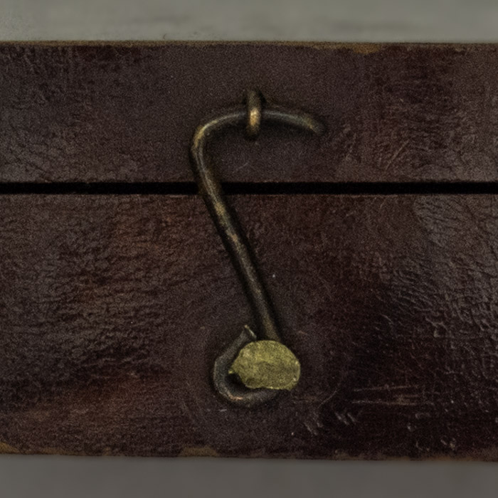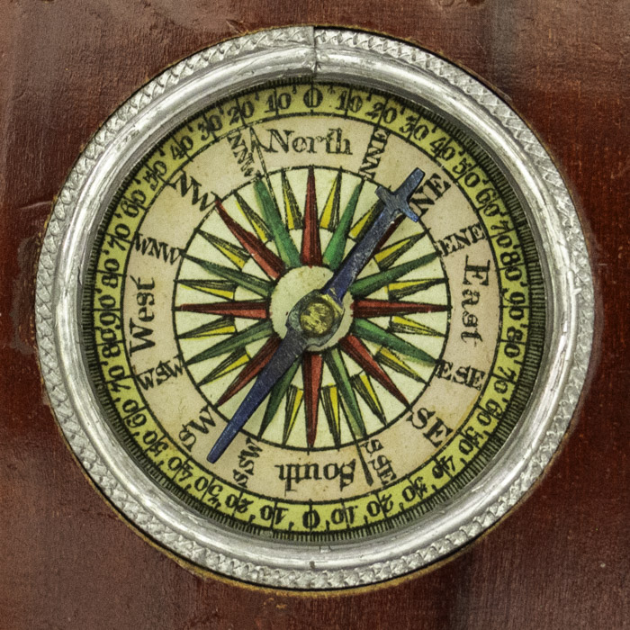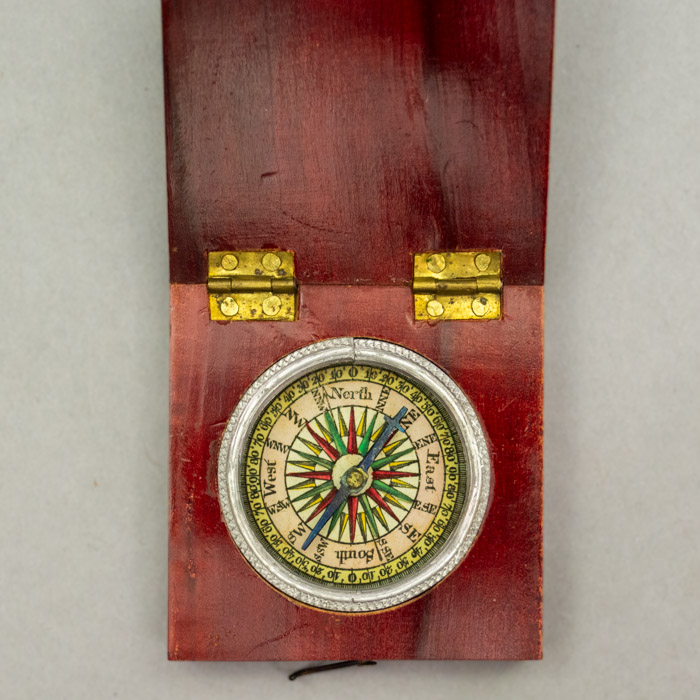 A traveling directional compass, set into a solid wooden case with reddish lacquer finish. The lid opens by two hinges to reveal the inset compass secured by an aluminum outer rim. The compass has a blue magnetized needle over apaper dial comprised of a central handsome compass rose with directional points brightly colored in red, green and yellow, within a concentric medial pink band with cardinal directions in English, and an outer concentric yellow band numbered in degrees. It closes with a hand-made metal hasp and brass nail head. It could have served multiple uses including travel, navigation, and plotting on a map or chart. The directional band in English suggests that the compass is American or English, though it also might have been Continental and made for export to those markets.