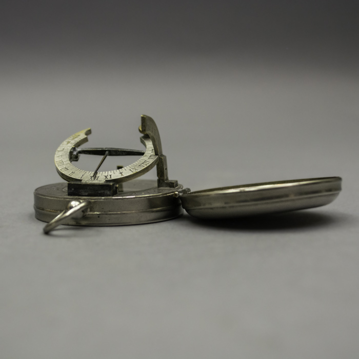 Condition: Very good antique condition. The metal exhibits a handsome, slightly oxidized patina and minor surface wear to nickel and silver plating commensurate with age and normal use. The hinges for the hour ring, gnomon, and latitude arc remain fully functional and articulate smoothly. The compass needle is intact and responsive, and the glass crystal is free of cracks.