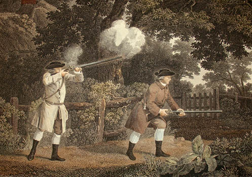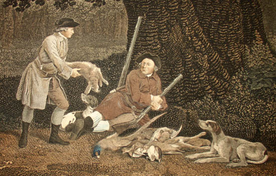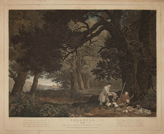 An inscription beneath each title states that they were engraved after original paintings in the collection of the publisher, Thomas Bradford, and gives the date of issue — they were each issued separately between 1769 and 1771. The author of the verses is unknown; that the hunters are portrayed as ordinary townsfolk and not privileged landowners makes both the paintings and the poem unusual for that era (Egerton). The first scene was painted by Stubbs and purchased by Bradford after being exhibited at the Society of Artists in 1767. Bradford then commissioned the next three paintings in order to have images to publish a set of four prints to be sold by subscription (Lennox-Boyd). The original paintings were all exhibited at the Society of Artists over the next few years; today they are in the collection of the Yale Center for British Art, a gift of Paul Mellon. The engravings are not identical to the paintings, possibly because some details were difficult to translate into engraving (Lennox-Boyd). Bradford died or retired around 1774, and the copperplates were sold. The images remained popular and firms such as Sayer & Bennett, Laurie & Whittle, Thomas Gosden, Boydell and Boydell’s successors continued to reprint and sell the engravings well into the 19th century.