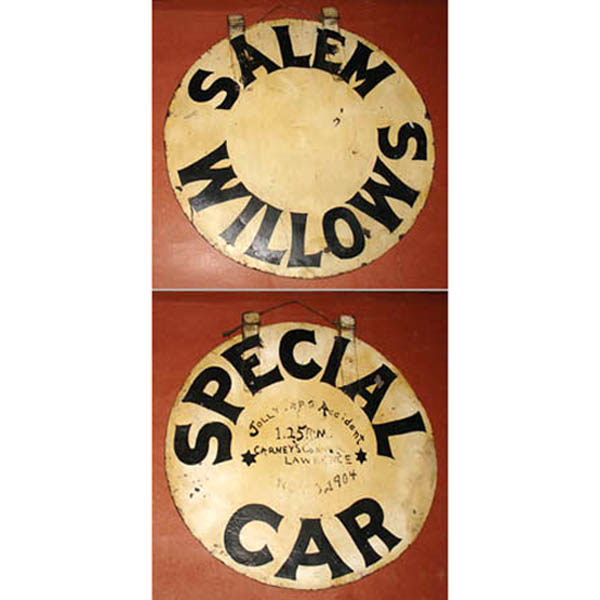 Two-sided round hanging sign (both sides shown in photo): “Salem Willows Special Car.”