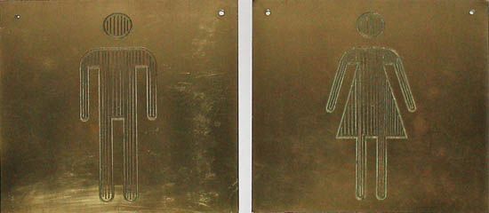 A pair of pictograph door plates, one a man, the other a woman. The stylized figure symbols are each incised into a substantial brass plate. These are likely a relatively early and high quality example of pictograph locker room or rest room signs. Now commonplace, pictograph rest room signs were innovative in 1967, when graphic designer Paul Arthur (1924-2001) designed symbols for use in the Expo 67 World’s Fair in response to fair organizers’ concerns that international visitors would not understand language-based signs. However, at the time a Canadian newspaper reported some confusion among visitors on how to interpret the male and female symbols on the signs.