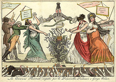 A satirical print depicting a competition for the “theatrical crown” between two famous French actresses of the early 19th century, Georges (Marguerite-Josephine) Weimer (1787-1867) and Catherine Duchesnois. Mademoiselle Duchenois starred in romantic dramas and revivals of the classics until she decided to quit for religious reasons around 1830. She is on the left, accompanied by supporters bearing signs extolling “sensitivity” and the roles of Phaedre, Hermione and Roxanne. Mademoiselle Weimer was a fabled beauty who made her acting debut in 1802 and was Napoleon Bonaparte’s mistress for a short time. Her supporters wave a banner that reads “Nobility and Beauty” and a list of roles including Clytemnestra and Dido. The “crown” they are competing for is protected by a thorny bush encircled with snakes surmounted by a two-faced judge. Meanwhile, a man pokes his head through a trapdoor in the stage and looks up at Mademoiselle Weimar. The satirist seems to be poking fun at the theater fans who take the matter seriously, portraying them as an assemblage of foolish turkeys and geese.