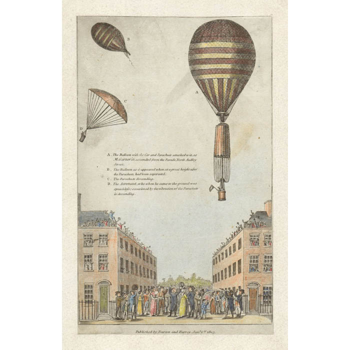 A. The Balloon with the Car and Parachute attached to it as Mr. Garnerin ascended from the Parthenon, North Audley Street.
