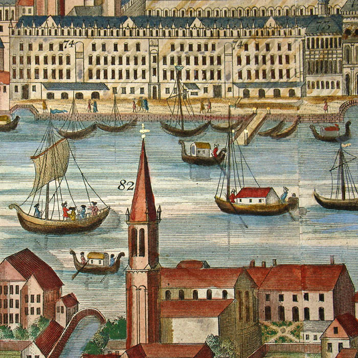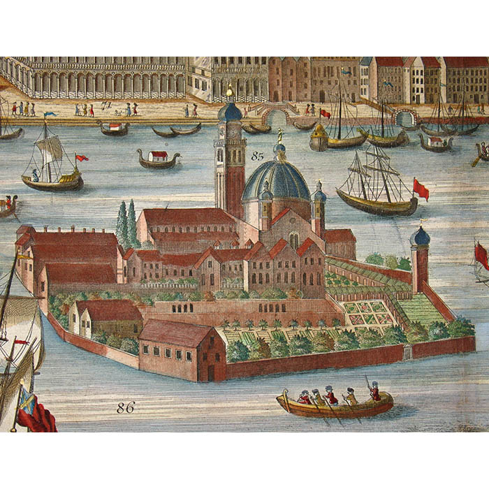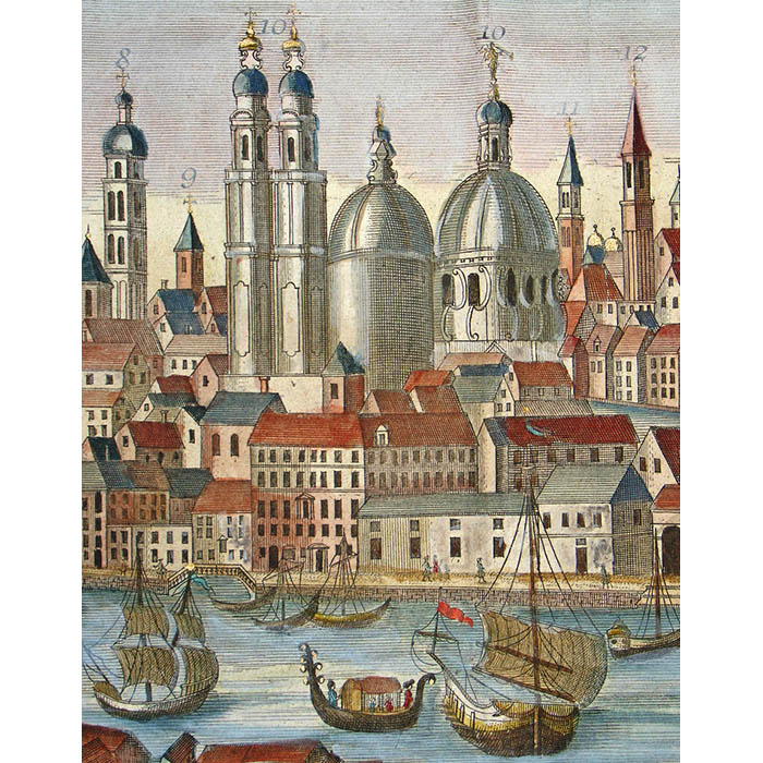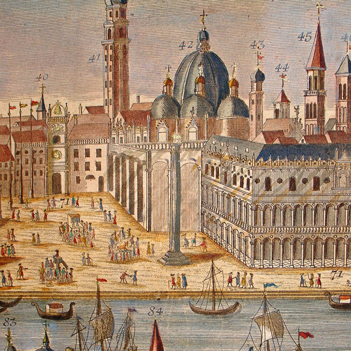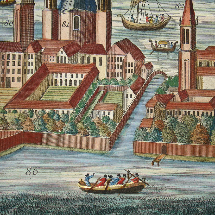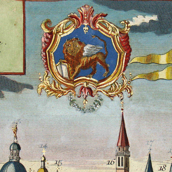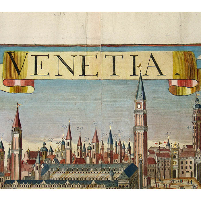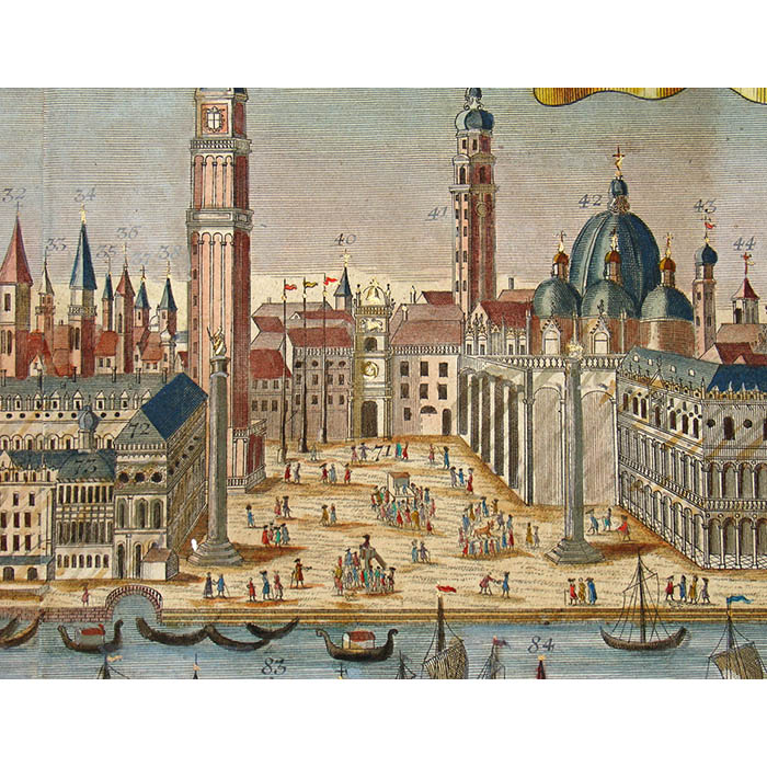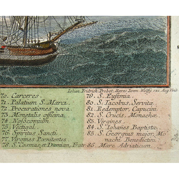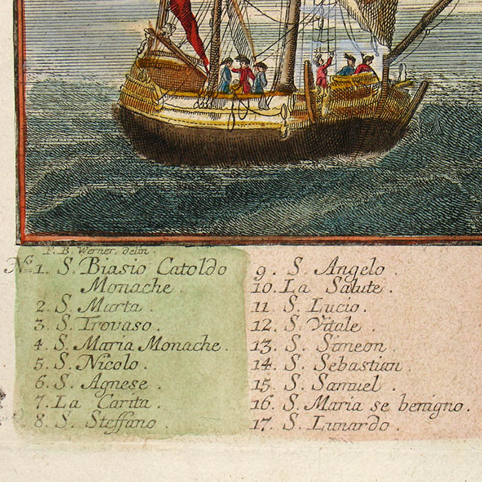 Werner’s Venice view is among a larger series of views of European cities in this format published by a group of related publishers in Augsburg, Germany, in the mid 18th century. They are often referred to as “Probst views” after one family of these publishers. These views typically depict the city from a slight elevation, not quite a bird’s-eye view. They are related to the earlier tradition of cartographic city views combining maps and landscape drawing as first published on a comprehensive scale by Braun & Hogenberg in Civitates Orbis Terrarum (Cologne 1572-1617). Nonetheless, the Probst views are each separately issued. The Werner Probst views are distinguished by the their large size that allows considerable architectural and landscape detail, extending to the delineation of farm buildings, boats and individual trees. Each includes a numbered key identifying important sites and buildings.