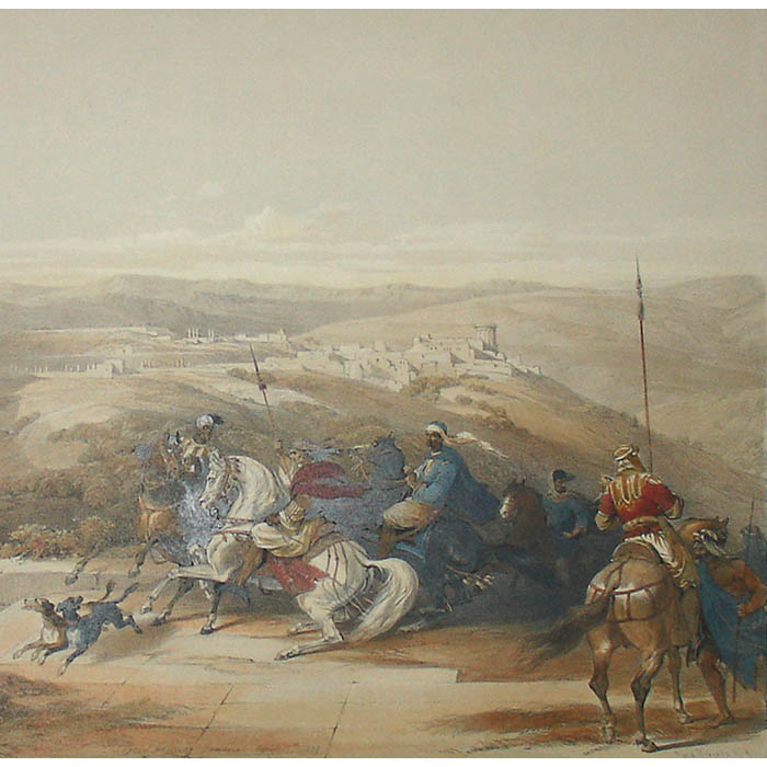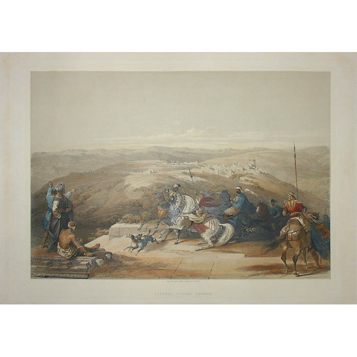 David Roberts was born in Edinburgh, Scotland. He began his career as a house painter and by 1816 was painting stage scenery for the theatre. In 1820 he met Clarkson Stanfield, who encouraged him as an artist, and in 1821 he moved to London, where he worked with Stanfield on sets at the Drury Lane Theatre. Roberts exhibited at the first show held by the Society of British Artists, and was able to become a full-time fine art painter in 1830. During the early 1830s he began to produce the sketches of foreign lands that were to make him famous, beginning with Spain. In 1838 and 1839 he undertook an extensive and adventurous journey to Alexandria, Cairo, and other places in the Middle East, making extensive sketches. He recorded broad vistas of the ancient world with local inhabitants, as well as detailed studies of classical architectural ruins. In the 1840s, over a period of seven years, lithographs of his sketches of the Middle East, together with text, were published in 41 parts in The Holy Land, Syria, Idumea, Arabia, Egypt and Nubia. According to J.R. Abbey, this work forms “one of the most important and elaborate ventures in nineteenth-century publishing, and … the apotheosis of the tinted lithograph.” Roberts also produced an illustrated work on Italy in the 1850s. His paintings are in many museum collections, including the Victoria and Albert Museum, London.