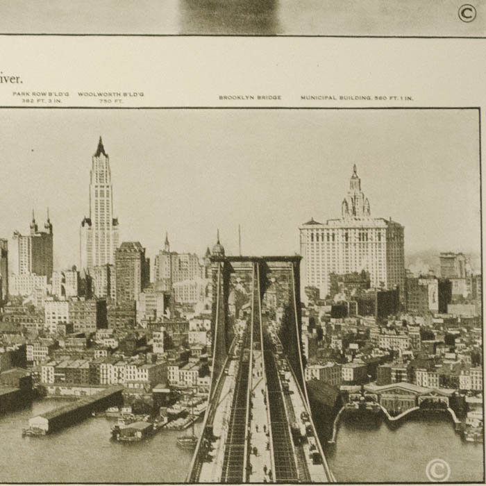 Some key landmarks are identified in small print above the lower view, from left to right: “Whitehall Building, 415 ft.; Banker’s Trust, 540 ft.; Singer Building, 612 ft.; Park Row B’ld’g 382 ft. 3 in.; Woolworth B’ld’g 750 ft.; Brooklyn Bridge; Municipal Building, 560 ft. 1 in.” The promotional copy beneath the photos reads: