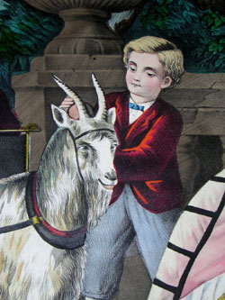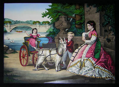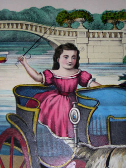 Two children prepare for a ride in a goat-drawn carriage in Central Park, under the supervision of their elegantly dressed mother, who is seated on a brown stone bench. The boy arranges the goat’s harness while the little girl waits in the carriage. Beyond them is the stone bridge over the lake. Vivid shades of red, blue, green and gold are set against the browns of the path and background. This print of Central Park in the summer has characteristic Schile subject matter and black margins. He also did a print of Central Park in the winter showing skaters on a pond and a horse-drawn sled.