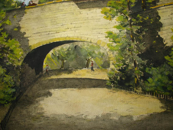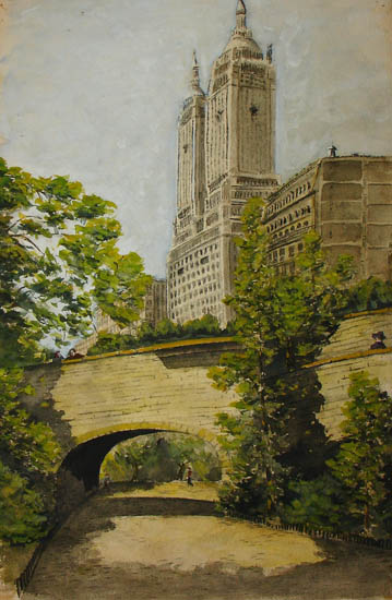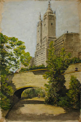 Watercolor landscape from a path on the west side of Central Park, looking south toward a pedestrian bridge and the two towers of the San Remo. The sunlit planes of the architectural elements contrast with the rich green foliage of the trees and shrubs. A few small figures walking through the park almost blend with their surroundings. The San Remo is an apartment building on Central Park West between 74th and 75th Streets. It was completed in the early 1930s, which helps date this painting.