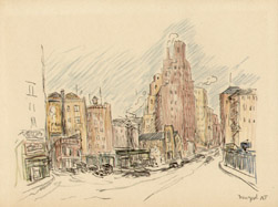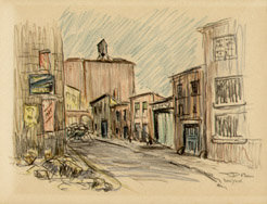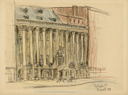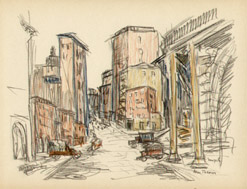 Alice Thévin was born near Paris, France, and spent her childhood first in Paris and then in Le Havre, where she attended the convent of Sacre Coeur. After earning her degree, she returned to Paris where her circle of friends included artists and writers. She came to the United States with American friends she had met in Paris. For several years she lectured on art and literature in Boston, Philadelphia and New York. Falling ill, she returned to France to recuperate. After recovering, she realized her long cherished ambition to become a painter. She preferred plein air painting in oils and watercolors, interpreting the Swiss and French countryside, villages and street scenes. Wherever she traveled, she looked for interesting subjects and would delve into the history and background information of her subject. As she grew older, Thévin divided her time between Europe and the U.S. America’s freewheeling atmosphere appealed to her restless, modern spirit and stirred her imagination: the pastoral old farm houses, barns and bridges of New Hampshire and Vermont, and the bustling, energetic metropolis of New York, where she enjoyed ferreting out the less obvious subjects: a forgotten church, a crooked street, a quaint corner, a tiny square, waterfront docks or a dilapidated tenement building. She exhibited her work in Paris, New York and Boston, though the act of painting was more important to her than an exhibition career. At her death she left behind many portfolios filled with sketches of Paris and New York.
