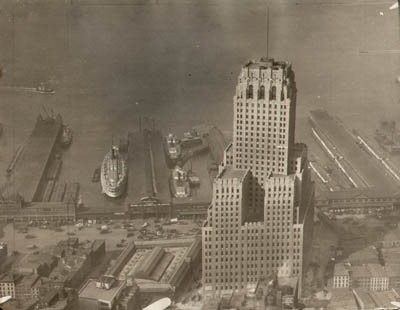 Inscriptions verso: “Sunday Feature 4 Page 1 From High Points of City. Ships buildings & docks are dwarfted [sic.] when viewed from the gallery atop the Woolworth Building where if it wasn’t for soft coal smoke the whole city could be viewed.”