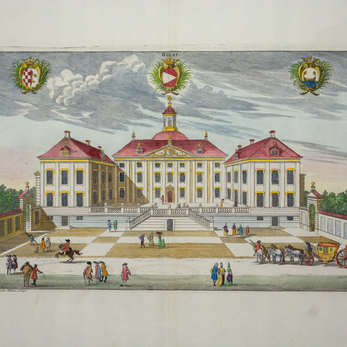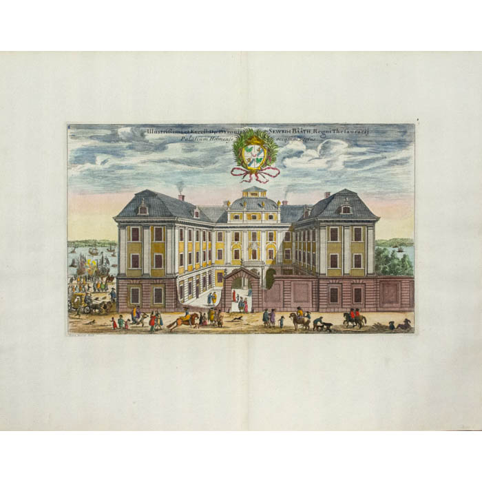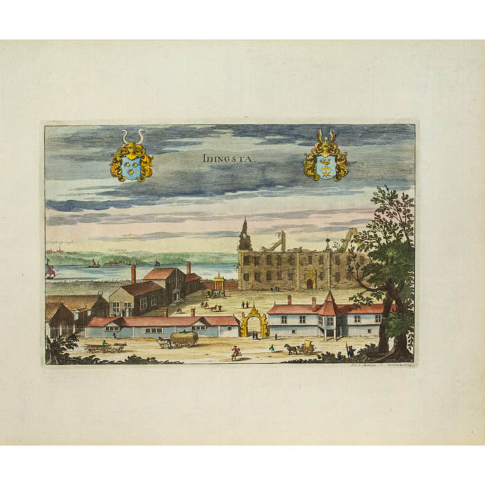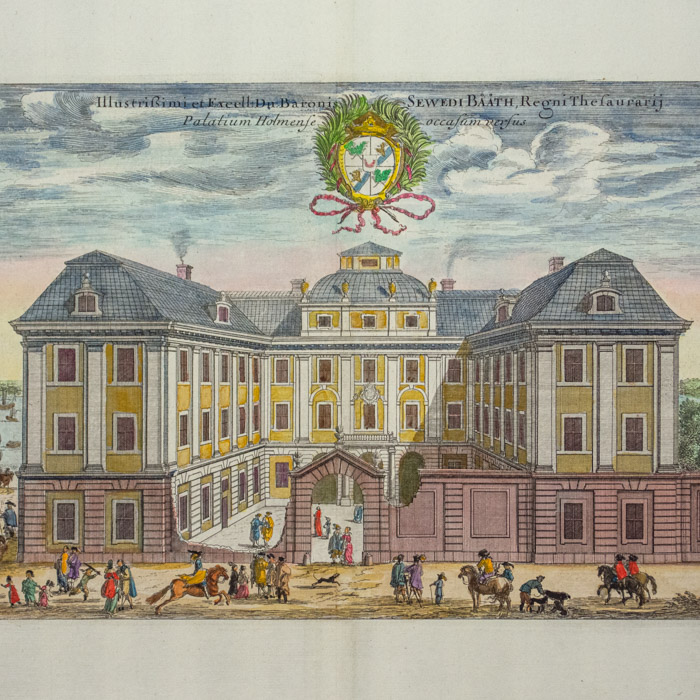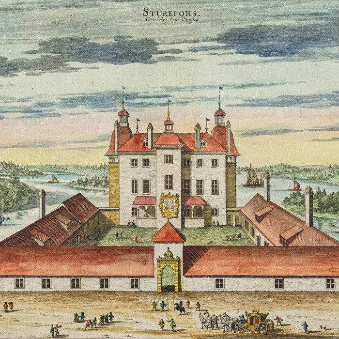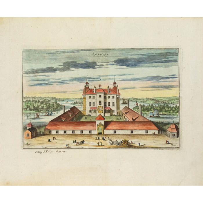 The engravings for Suecia progressed over several decades between 1668 and 1715, mainly executed by French and Dutch artists and engravers, who were more technically advanced than their Swedish counterparts. Dahlberg visited Paris in 1667-1668 and engaged Jean Le Pautre, Jean Marot, Nicolas and Adam Perelle and F. Campion to produce some 70 plates picturing Stockholm, Uppland and Södermanland. Le Pautre also engraved the title page. The Swedish government later decided to move production to Sweden, and the major contribution to the project was the work of two Dutch engravers, Willem Swidde and Johannes Aveelen, who engraved 223 plates altogether. Between 1688 and 1696, Swidde produced 84 plates including a map and 10 landscapes. Aveelen arrived from Holland in 1698 and worked on Suecia until 1715, producing 144 plates, 20 major ornamental elements and five signed drawings that he also engraved. A few plates were produced by other engravers.